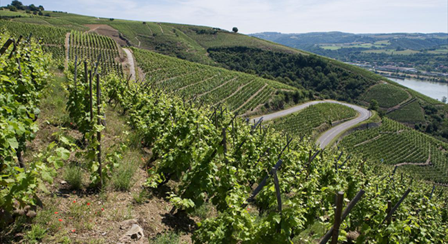 在北羅納河谷(Northern Rhone Valley),獨(dú)特的地形和氣候條件鑄就了風(fēng)格極為強(qiáng)勁的西拉葡萄酒。這里緯度較高,且常年有密斯托拉風(fēng)(Mistral)吹拂,氣候十分涼爽,是西拉葡萄可以達(dá)到完全成熟的臨界環(huán)境。正是在這樣的環(huán)境下,西拉的品種魅力被完全激發(fā)出來。葡萄園大多坐落在東西走向的山谷地帶,以降低從北方吹來的密斯托拉風(fēng)的影響,且多分布于朝南向的陡峭山坡上,有利于葡萄樹接收充足的陽光和熱量。