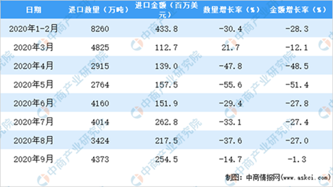 數2020年1-9月中國葡萄酒進口量及金額增長情況
