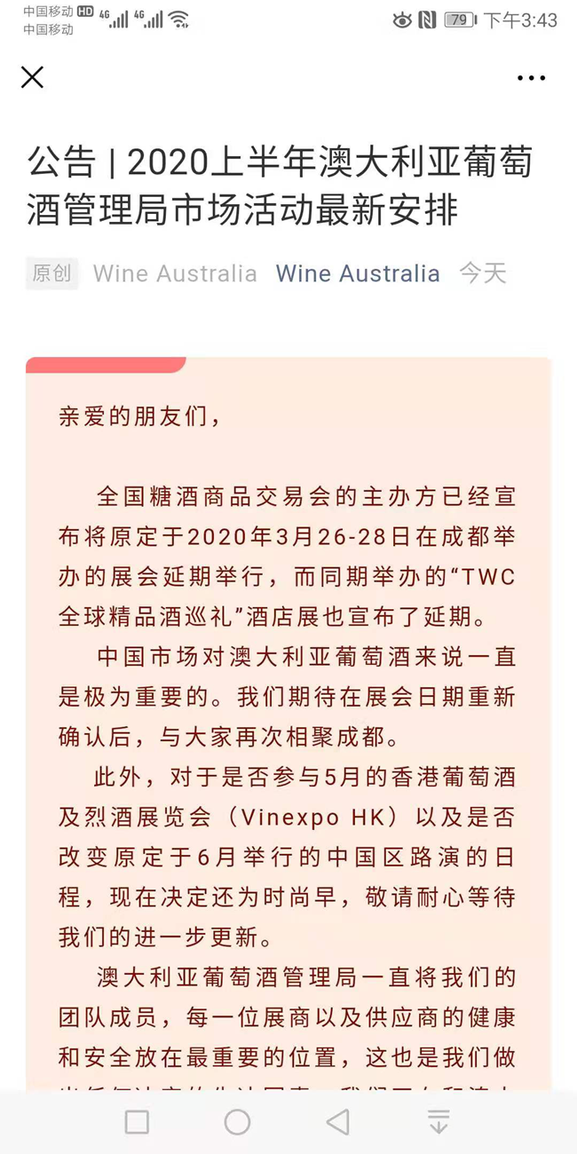 2月5日,澳大利亞葡萄酒管理局市場部總經理Stuart Barclay在一份公告中表示,中國市場對澳大利亞葡萄酒來說一直是極為重要的。“我們期待在展會日期重新確認后,與大家再次相聚成都。”